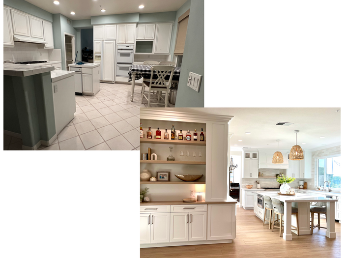 We took this drab 1990’s kitchen into a bright and airy coastal vibe with rattan pendants, white quartz counters and white oak accents!